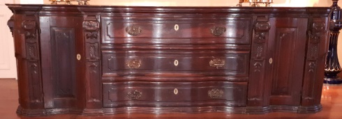 Móvel com estrutura retilínea. Parte frontal em curvas e contracurvas; na parte central três gavetões, com fechadura e com puxadores em metal; nas laterais, portas com almofadas côncavas; frisos contornando a estrutura.