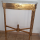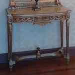 Móvel com estrutura retilínea, em madeira com douramento. Mesa com estrutura retangular com laterais recortadas, guarnecida por ornatos de perolado; cinta com reservas com de ondas e perolado; quatro pernas unidas por trave em "H"; trave encimada por pináculo; pernas com fuste em caneluras; pés em carapeta. Tampo de mármore.