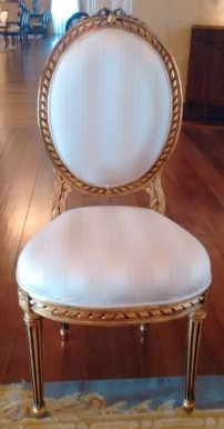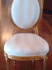 Móvel com espaldares ovais contornados por ornamentos de torçal e unidos aos assentos por peças curvilíneas, decoradas por folhas estilizadas. Peças estofadas com tecido lavrado, na cor bege, com listras.