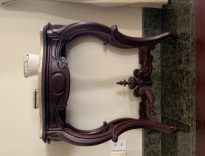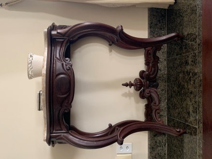 Mesa - console com tampo de mármore recortado em curvas e contracurvas. Aba recortada e contornada por frisos encavos; ao centro reserva oval com círculo. Pernas sinuosas formadas por dois “C” invertidos; pés em carapeta. Unindo as pernas, trave formada, com o mesmo tratamento das pernas; no centro, pináculo.