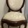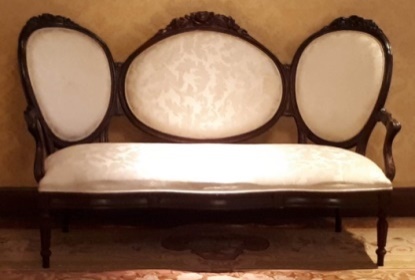 Canapé com estrutura do assento com parte anterior com curvas e contra-curvas; nas partes côncavas dessa estrutura, pequenas almofadas com losango. Espaldar dividido em três partes, a do meio de forma oval e as laterais em forma de coração; as três partes do espaldar são unidas por traves lisas; cachaço com flores. Braços sinuosos, voltados para fora. Pernas dianteiras torneadas; fuste com caneluras; pernas traseiras em sabre.