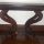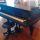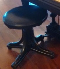 Banco de piano com assento circular estofado em couro preto ; coluna central torneada de onde partem três hastes curvilíneas que ficam apoiadas sobre em forma de trave em “X” , com rodízio nas extremidades.