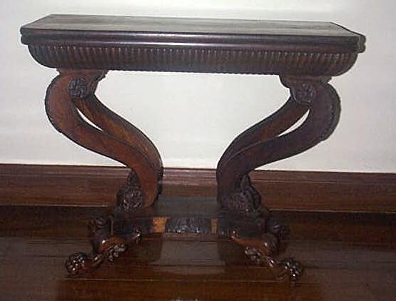 Mesa com tampo retangular liso, dobrável, com cinta de gomos, com cantos abaulados. Pernas em forma de “S”; parte superior terminando em rosácea; pés em garra.