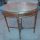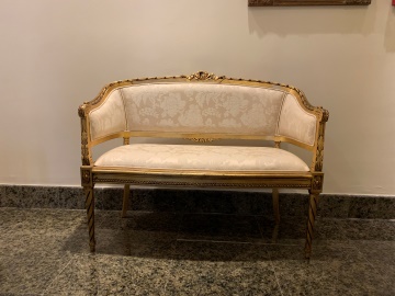 Sofá com assento trapezoidal; cinta com ornamento de folhas; pernas dianteiras em torçal e as trazeiras em sabre. Espaldar recortado com espaço do apoio braçal fechado; ao centro do espaldar ornato flores; cinta das cadeiras ondulada.