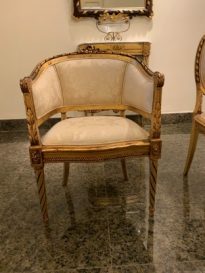 Cadeira com assento trapezoidal; cinta com ornamento de folhas; pernas dianteiras em torçal e as trazeiras em sabre. Espaldar recortado com espaço do apoio braçal fechado; ao centro do espaldar ornato flores; cinta das cadeiras ondulada.