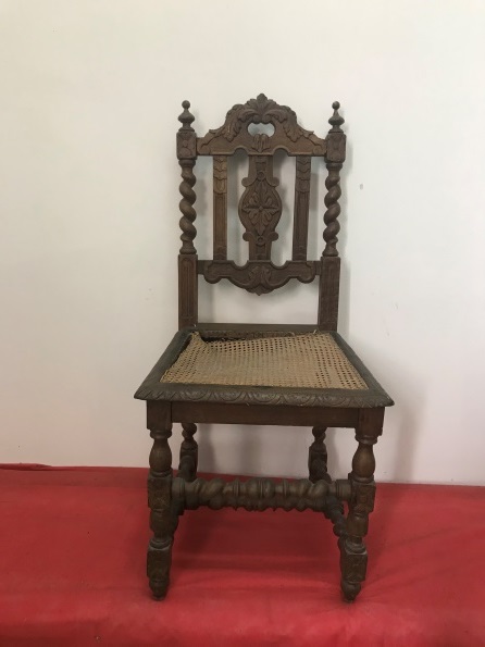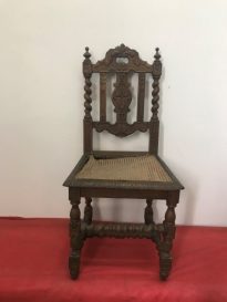 Cadeira em madeira e palhinha. Assento trapezoidal Espaldar vazado e recortado com tabela retangular com entalhes de elementos naturalista. Duas colunas laterais, em torçal, tendo na parte superior elemento retangular com rosácea e encimado por pináculo. As colunas unem-se às pernas trazeiras, que também são em torçal, por traves torneadas. As pernas dianteiras torneadas são unidas por trave em balaústre. As pernas trazeiras unem-se às dianteiras por trave em “H” também em balaústre.