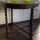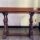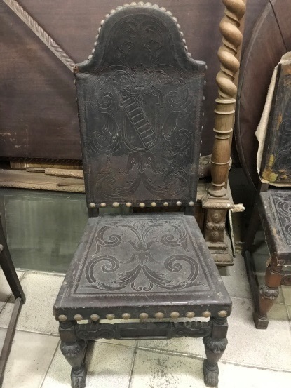 Cadeira sem braço; assento trapezoidal e espaldar retangular e arredondado na parte superior em couro pirografado preso à madeira com capitães em metal. Pernas trazeiras lisas e em sabre. Pernas dianteiras piriforme com parte superior com ornatos de folhas, unidas por trave que tem as extremidades com ondas entalhadas e aparte central com retângulo liso. As pernas dianteiras unem-se às trazeiras por traves lisas; pés retangulares.