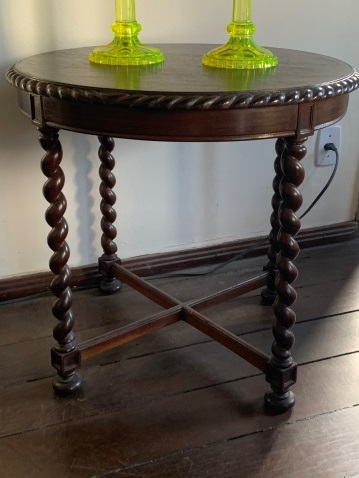Mesa com tampo circular contornado por ornato de torçal. Cinta lisa. Pernas em torçal unidas por hastes lisas que formam uma trave em “H”; pés em bolacha.