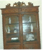 Móvel com estrutura retilínea. Duas portas com estrutura de madeira; parte superior em vidro e parte inferior cega, com entalhes de elementos fitomorfos ; laterais com colunas em torçal. Parte superior com ornatos fitomorfos estilizados. Frontão recortado com ornatos de elementos naturalistas; ladeado por dragões. Na parte inferior do móvel, gavetas com ornatos naturalistas. Na parte interna duas prateleiras.