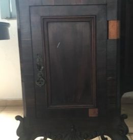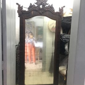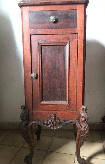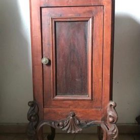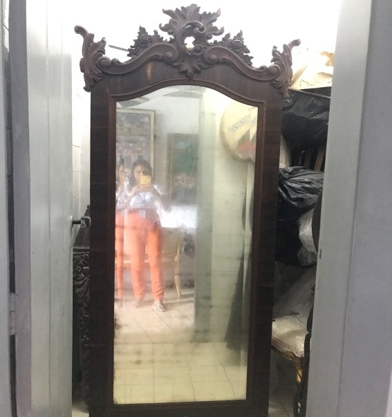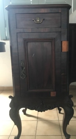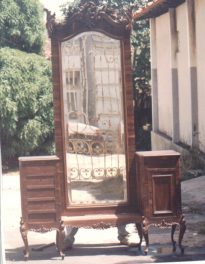 Móvel com estrutura retangular; espelho em cristal bisotê. Parte superior recortada e frontão com rocaille e elementos fitomorfos. Criados mudos; tampo retangular com tampos chanfrados; nas laterais, almofadas guarnecidas por molduras simples; na parte frontal, gaveta e porta com almofada guarnecida por moldura simples; aba com entalhes de volutas e elementos fitomorfos estilizados. Pernas sinuosas terminando em volutas voltada para dentro, com joelhos decorados com folhas de acanto, pés em cachimbo.
