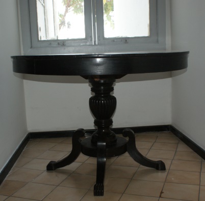 Mesa com tampo circular; cinta lisa. Coluna central à feição de jarro; parte superior e inferior em aneletes e fuste em gomos. A coluna repousa sobre disco de onde partem quatro pernas, com extremidade superior terminando em voluta voltada para dentro e a inferior em garras.