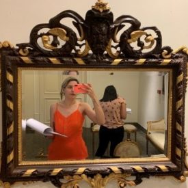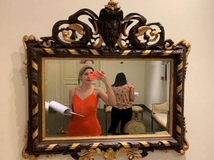 Espelho em cristal bisotè. Moldura retangular em madeira escura com folhagens em relevo entremeada por torçais dourado; próximo ao espelho, ornato de perolado. Nos cantos mísulas em madeira com douramento. Parte inferior com ornatos de folhagens em dourado. Frontão em forma de concha estilizada e tenso ao centro entalhe de máscara; nas laterais volutas e folhagens estilizadas.
