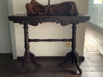 Mesa com tampo retangular; abas recortadas em curvas e contracurvas, na parte central, e com ornatos de volutas. Pernas torneadas, com fuste liso e extremidades em aneletes, terminando em pináculo. Três pés lisos e recortados. Pernas unidas por trave em balaústre.