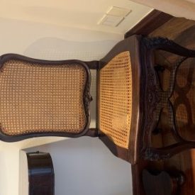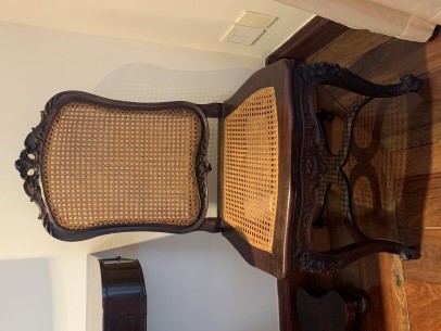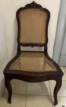 Cadeira em madeira e palhinha, sem braço. Espaldar retangular e recortado em curvas e contracurvas, com ornamentos de elementos naturalistas; o espaldar une-se ao assento por traves curvilíneas. Assento trapezoidal; aba recortada com ornamento floral. Pernas sinuosas.