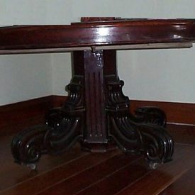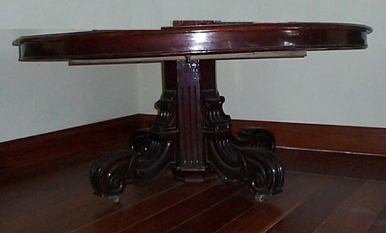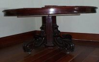Mesa com tampo circular com cinta lisa. Perna central com sextavada, duas faces com caneluras. Das outras quatro faces partem pés em dois planos: o primeiro plano é estriado e com volutas voltadas para fora; o segundo plano também é estriado e com volutas para dentro; pés em rodízio.