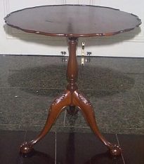 Mesa com tampo circular recortado e guarnecido por frisos; coluna central torneada, de onde partem três pernas recurvas e com ornatos de folhagens na parte superior, pés arredondados e com ornatos de folhagens.