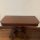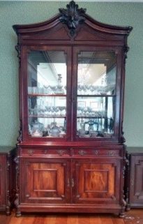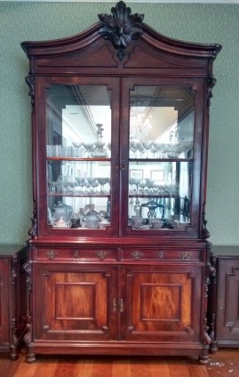Móvel com estrutura retilínea, dividido em dois corpos. Parte inferior com estrutura retangular. Duas portas com almofadas, com cantos interrompidos, com molduras formadas por duas ordens de hastes de madeiras; internas e essas almofadas, outras almofadas retangulares. Nas laterais do móvel, almofadas semelhantes a das portas; parte interna com uma prateleira. Parte superior, portas e laterais com moldura de madeira e vidro. Frontão interrompido; no vértice folha estilizada com rosácea ao centro. Parte interna com duas prateleiras. Pés em bolacha.