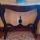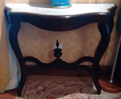Mesa console em madeira jacarandá com tampo de mármore, estilo Luís Felipe. Aba recortada; pernas sinuosas unidas por traves recortadas e encimadas por um pináculo. A peça é desprovida de qualquer decoração.