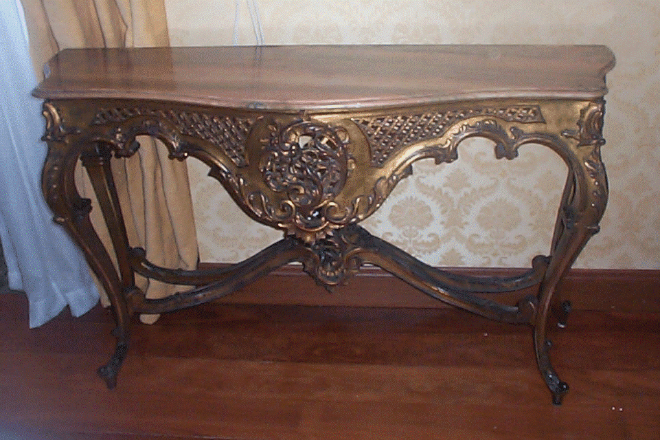 Mesa console com tampo de mármore recortado; aba recortada, decorada com treliças e rocalha. Pernas arcadas decoradas com elementos naturalistas em alto relevo; trave de sustentação unida por rocalha e concha. Pés de cachimbo.