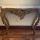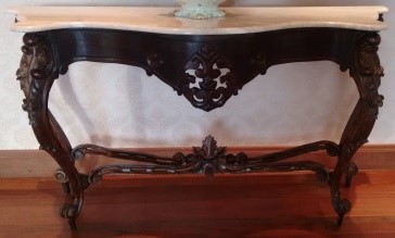 Mesa console com tampo recortado. Aba decorada com entalhe vazado - elementos naturalistas. Pernas dianteiras formadas em “C” com decoração de elementos naturalistas em alto relevo. Traves de sustentação unidas por dois elementos que lembram folha de palmeta, sendo um invertido. Pés em cachimbo.