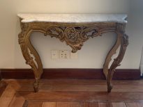 Par de mesas consoles com tampo recortado. Aba com elementos sinuosos formando três “C”. Pernas dianteiras formada por dois “C” decoradas com rosas; pernas trazeiras recortadas e lisas; tampo de mármore. Pés em volutas.