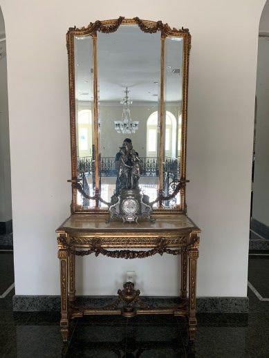 Aparador com espelho. Na parte superior destaca-se guirlanda. Moldura do espelho ornada na parte superior por guirlandas; nas laterais frisos ondulados e filetados. Moldura possui suporte para vaso. Tampo de mármore; borda decorada com rosário. Cinta com entalhe vazado de folhas de palmeta, pequenas rosáceas, reserva oval em folha de acanto. Parte inferior da cinta com guirlandas. Pernas decoradas com folhas. Trave de sustentação terminando em pinha ladeada por guirlanda. Pés com entalhes de folhas, terminando em cachimbo.