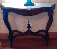 Mesa console com tampo de mármore. Aba recortada; pernas sinuosas unidas por traves recortadas e encimadas por um pináculo. A peça é desprovida de qualquer decoração.