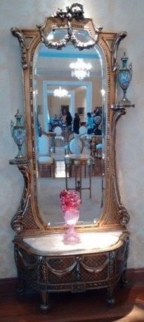Floreira com espelho, moldura decorada com rosário, ao lado suporte para vaso (sobre rocalha). Base da floreira em mármore, cinta entalhada com ornatos de ponta de diamantes e grande laço em relevo. Pés em volutas terminando em cachimbo.