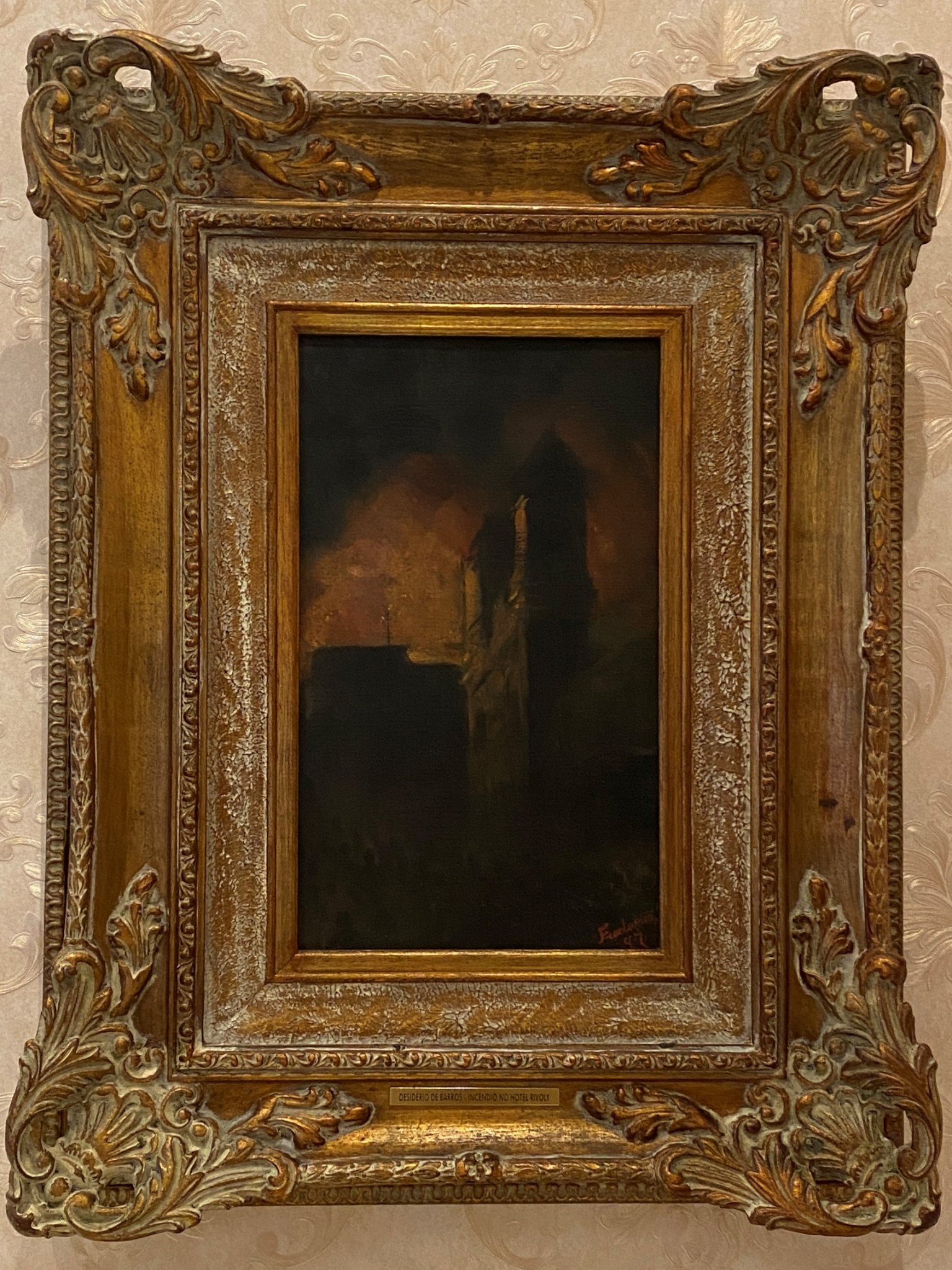 0004 Voltar 24 de junho de 2021 por   Documento 4 Baixar Anexos 004 4 Metadados Miniatura Compartilhar Número de ficha0004SérieColeção Arthur AzevedoTítuloIncêndio no Hotel RavolyAutorFrederico Desidério de BarrosDescrição da ObraComposição apresentando em primeiro plano, 02(duas) torres. Ao fundo outra edificação. Fundo da tela, na parte superior, é avermelhado sugerindo chamas.TécnicaÓleo sobre telaDataSéculo XIX - 1897Marcas/ Inscrições / LegendasObra oferecida a Arthur AzevedoAltura36,7 cmLargura21,5 cmAssinaturaFrederico,97ProcedênciaColeção Arthur AzevedoModo de AquisiçãoCompra - 1910Responsabilidade ImediataCuradoria de Bens Culturais do Palácio dos LeõesProteção legalGoverno do Estado do MaranhãoCondições de SegurançaBomObjeto Restaurado?Não Continue navegando 0003 0005 Voltar para a página de itens