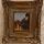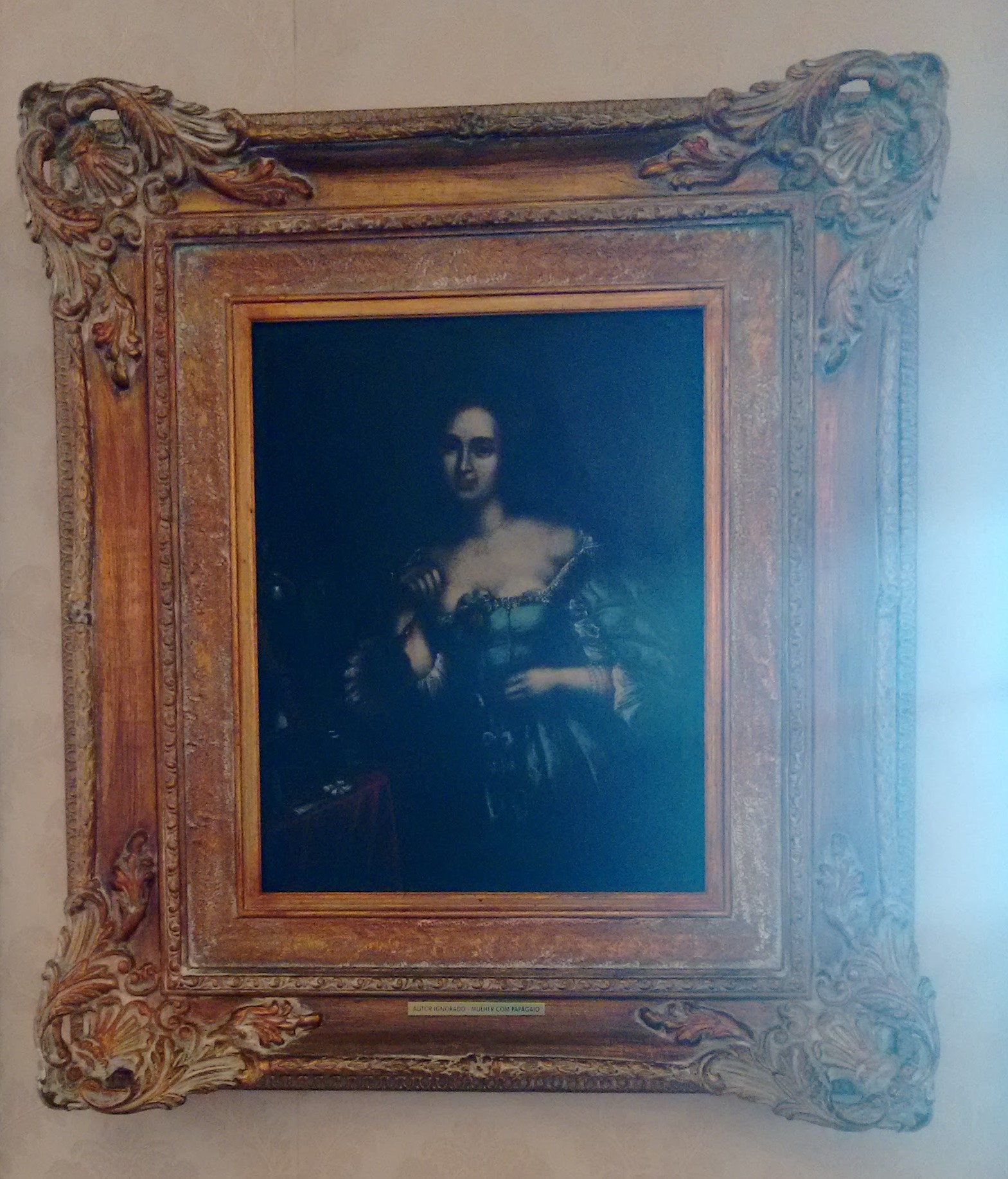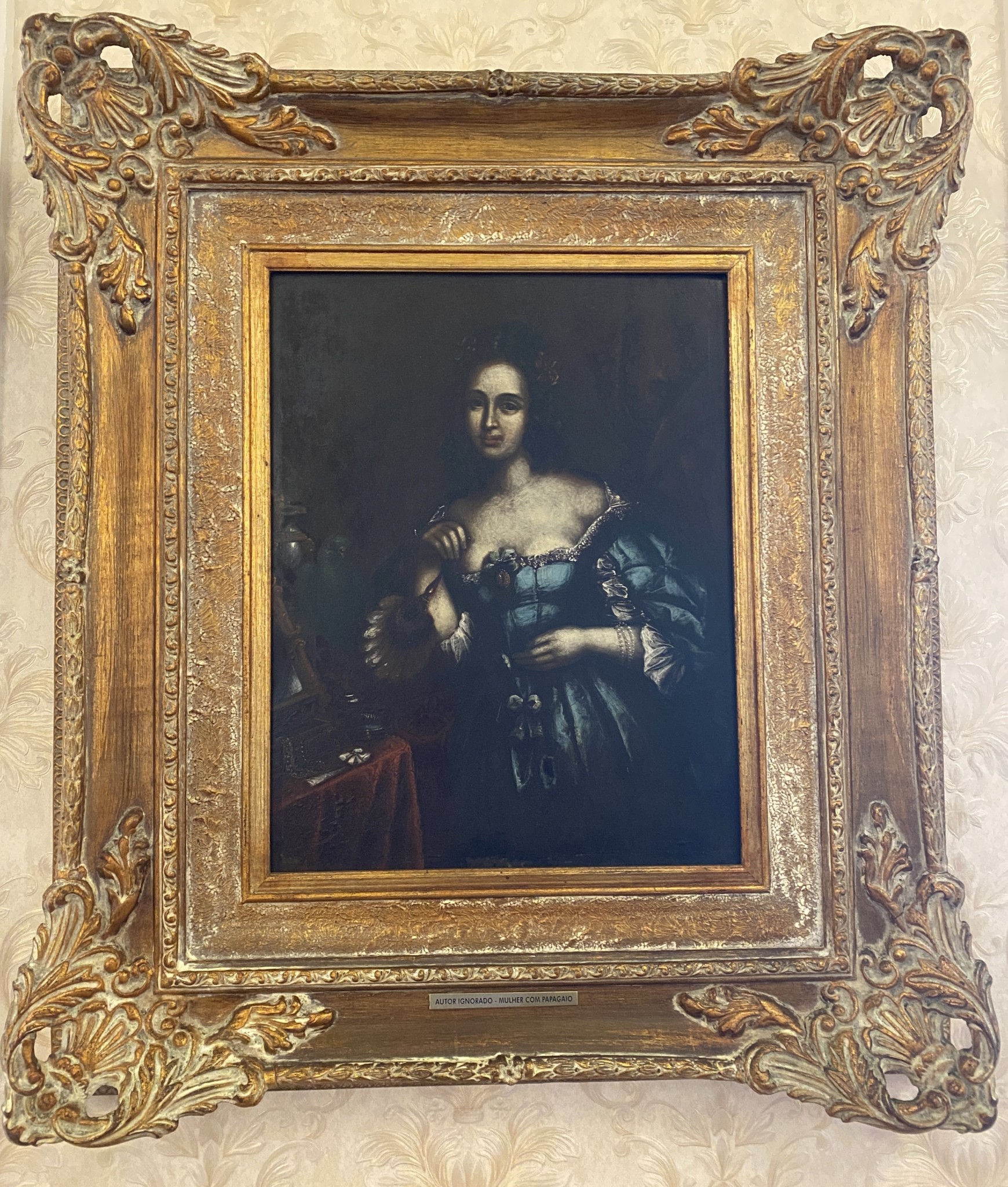 Composição tendo ao centro figura feminina trajando um vestido azul com mangas bufantes; colo amostra. No braço esquerdo pulseiras de pérolas e, na mão direita, provavelmente um leque. Do lado direito da tela a parece, ao fundo, um papagaio.
