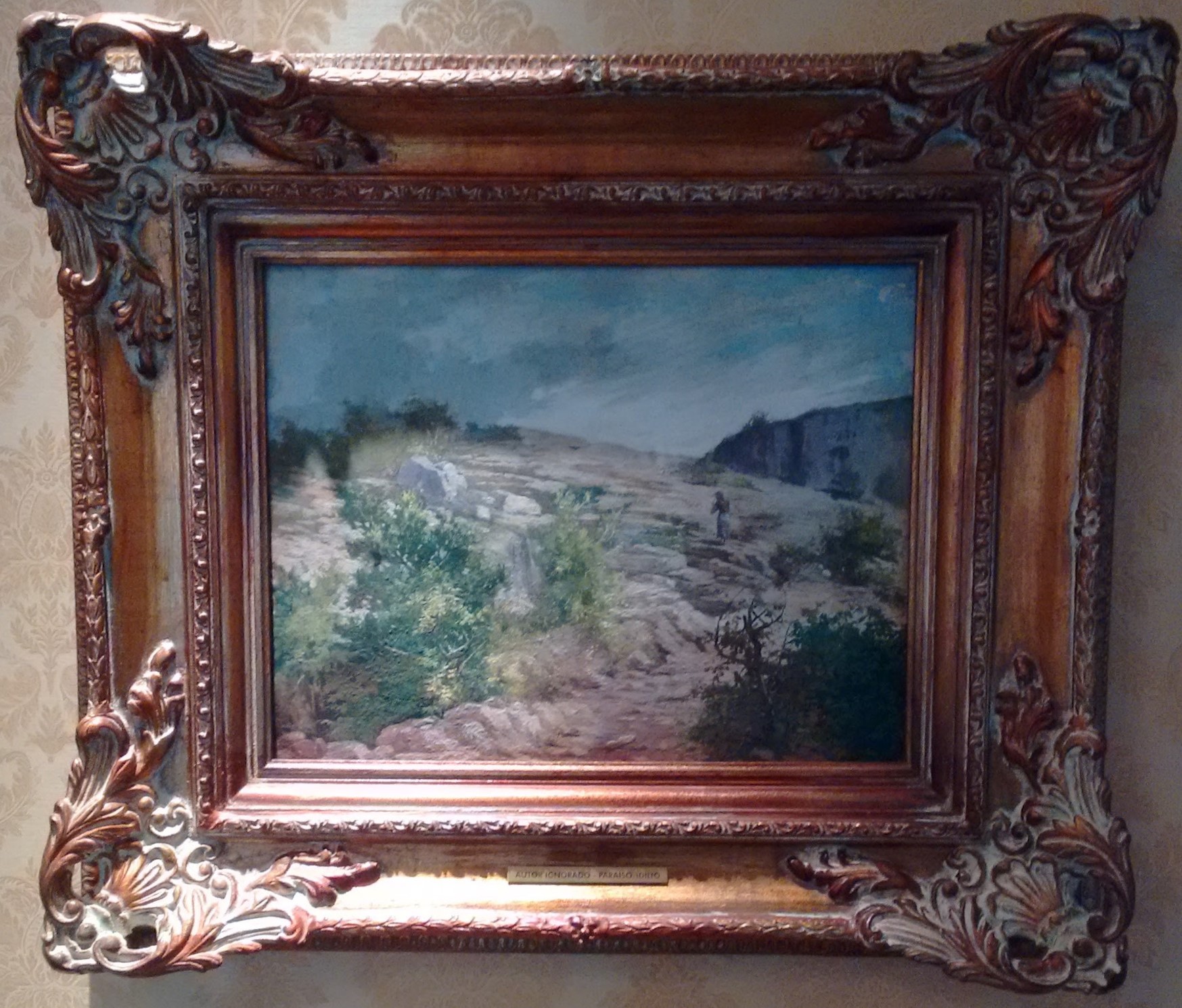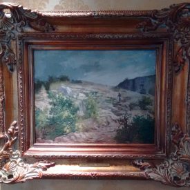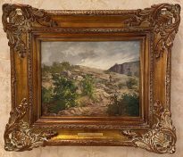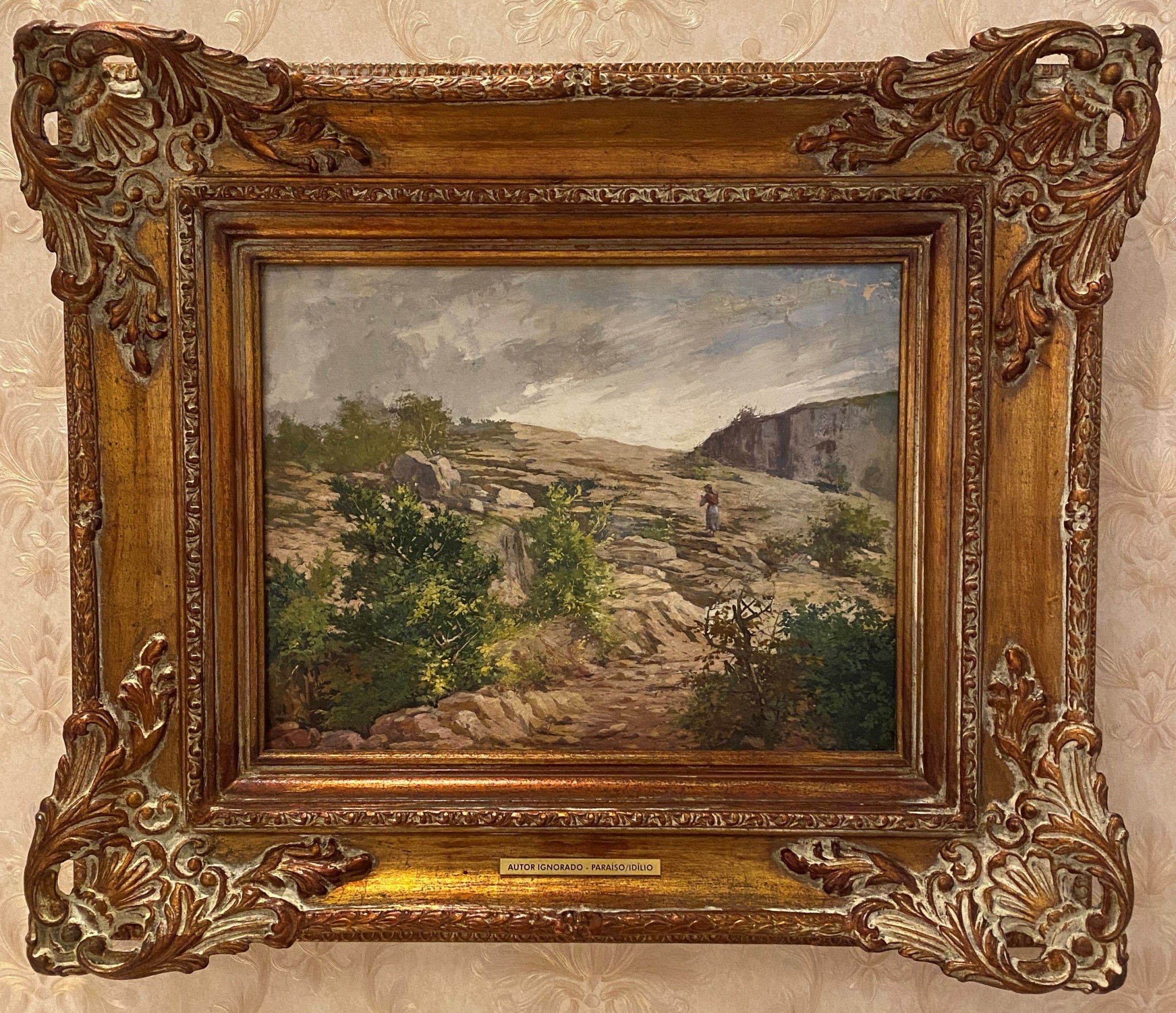 Pintura retratando paisagem. Figura feminina, trajando vestido azul e xale vermelho, caminhando pelas montanhas. A parte superior da composição é uma larga faixa azul representando o céu; chão arenoso com algumas vegetações rasteiras.