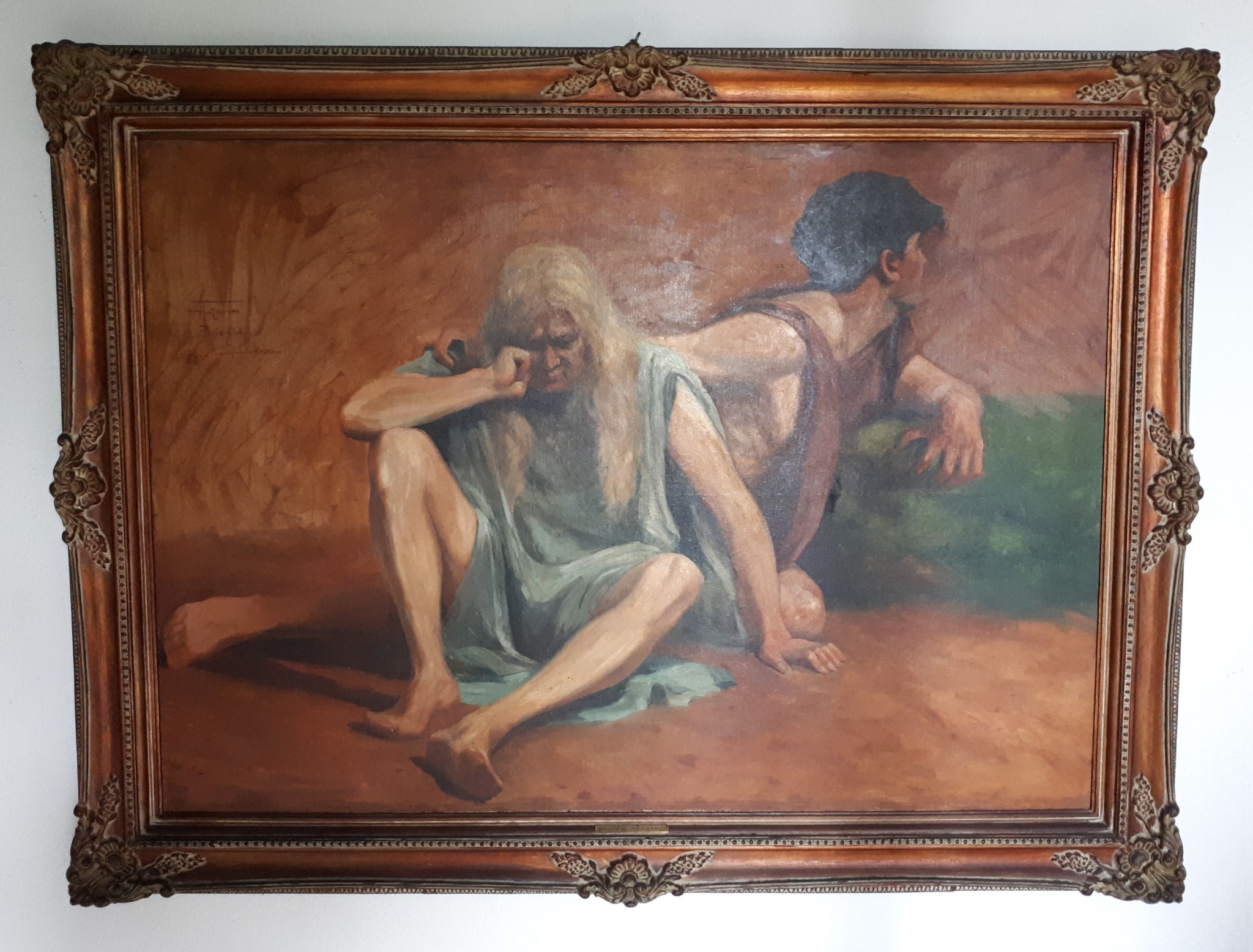 Composição retratando duas figuras masculinas sentadas no chão. Em primeiro plano figura de ancião, com perna direita flexionada e levantada; mão esquerda espalmada no chão; braço direito apoiado na perna direita ,com mão esfregando olho direito, dando a impressão de que está chorando; cabelos longos divididos ao meio, e caindo sobre os ombros. Em segundo plano, figura de homem jovem; corpo voltado para a esquerda, olhando para trás; cabelo preto. Do lado esquerdo da tela, a seguinte inscrição: “A Parreiras – Paris 1906 - Estudo – Conquista do Amazonas”.