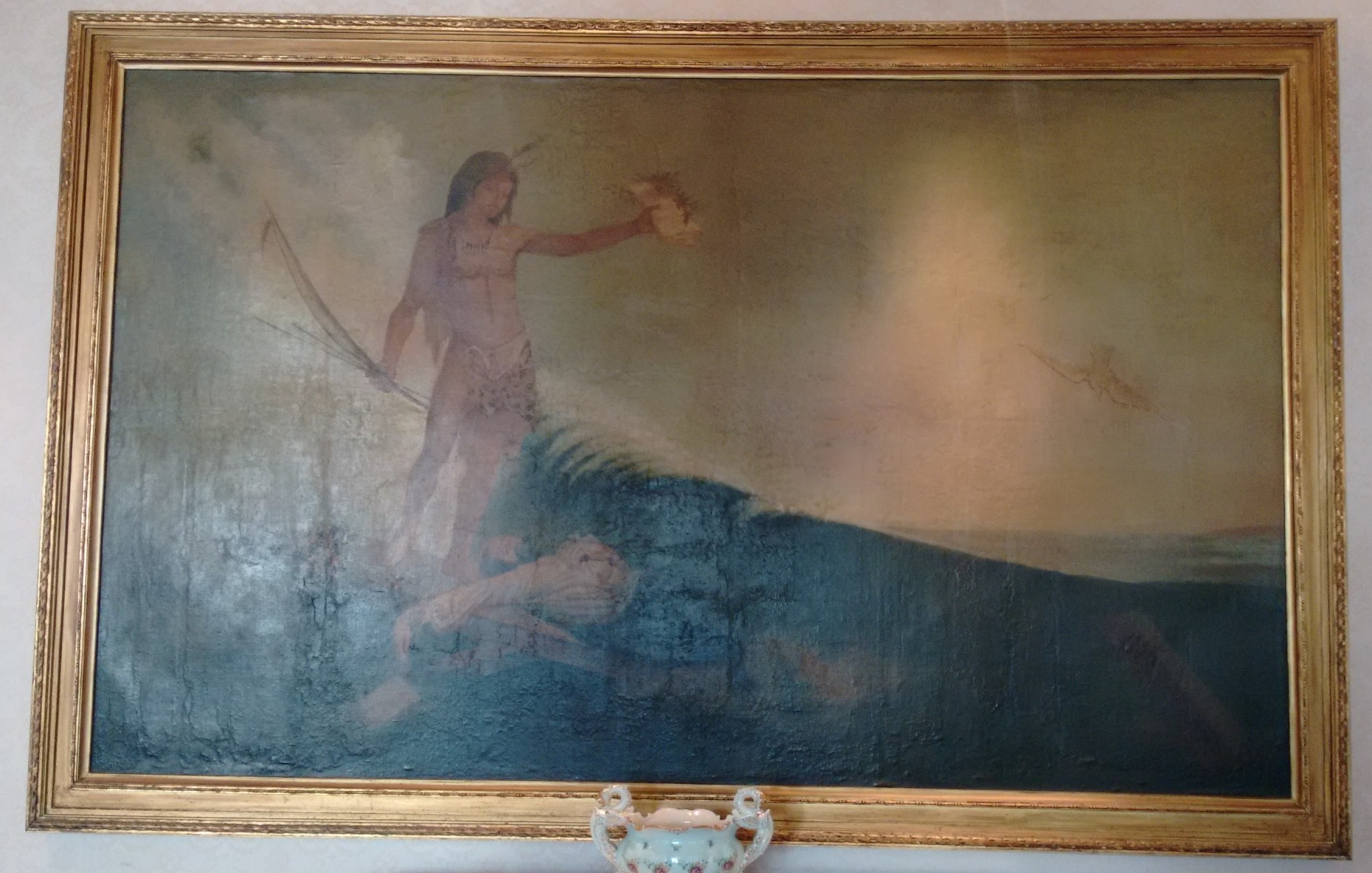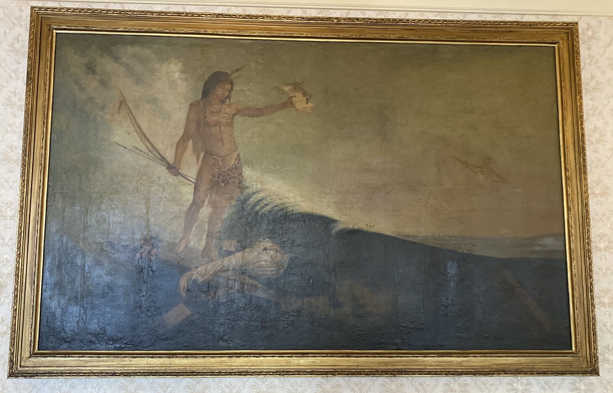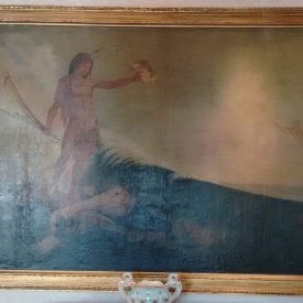 Tela retratando morte do poeta maranhense Gonçalves Dias. Poeta deitado sobre cruz de madeira; sobre a haste vertical da cruz figura de indígena, segurando na mão direita arco e flecha; braço esquerdo levantado segurando folhas de papel. Do lado direito da tela, pássaro voando. No canto inferior direito, parte do navio Ville de Boulogne, que afundou em 1864, vindo da Europa.