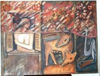 Composição dividida em três partes. Da esquerda para a direita, figura feminina na janela; mulher, despida, com cabeça levemente voltada para esquerda; braço esquerdo apoiada no peitoril da janela e braço esquerdo sobre o direito, com mão segurando o antebraço direito. Ao meio, dois animais.. Do lado direito da tela, uma garça. na parte superior da tela espécie de véu com flores, que cobre o rosto da figura feminina.