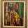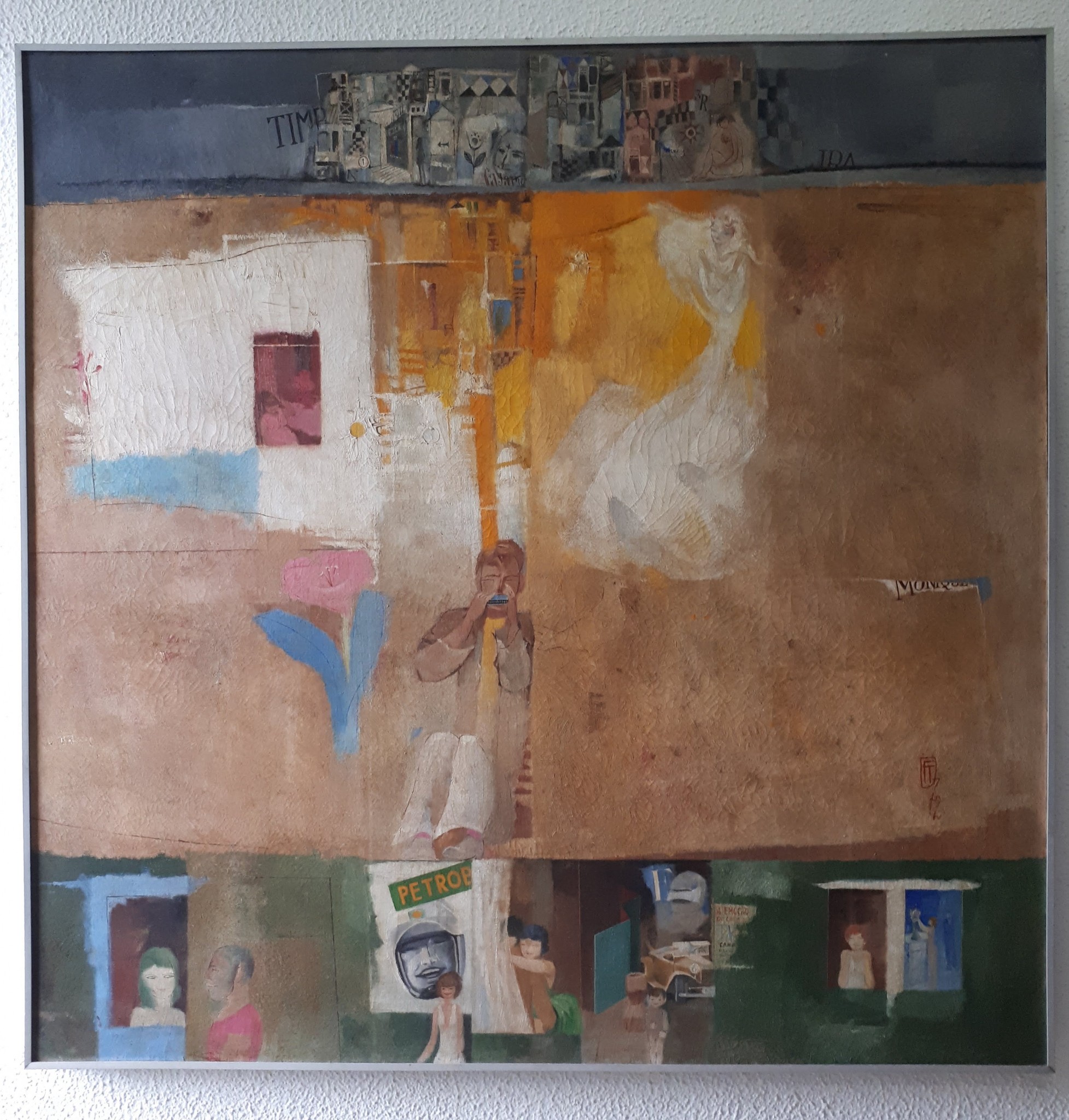 Composição dividida em três planos. No plano inferior, figuras femininas e masculinas. No plano mediano, figura masculina sentada e encostada em uma estaca; do lado direito da tela uma rosa. No plano superior, em tons de cinza casario e pessoas.