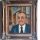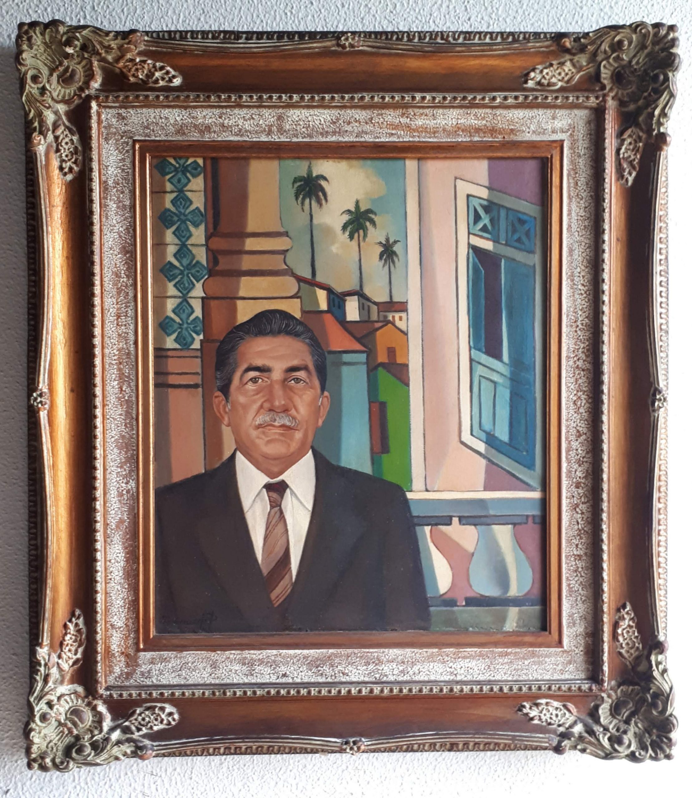 Tela retratando, no lado direito , o Governador Ivar Saldanha; trajando terno cinza, camisa branca e gravata marrom; cabelos pretos e bigode grisalho. Ao fundo casario; detalhe de edificação com parede azulejada e pilastra. Do lado esquerdo da tela, casas com parede rosa e janela azul.