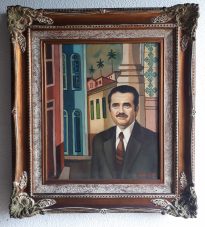 Tela retratando, no lado direito, o Governador João Castelo trajando terno marrom, camisa branca e gravata marrom; olhos azuis; cabelos e bigode preto. Ao fundo casario; detalhe de edificação com parede azulejada e pilastra. Do lado esquerdo da tela, casas com paredes rosa e azul.