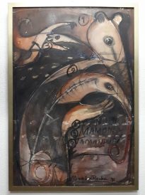 Tamanduás numerados em 1-2-3 ocupam toda a tela em diversos tamanhos. As figuras centrais formadas por três tamanduás nos tons de marrom e preto são contornados em traços pretos. As figuras estão superpostas. O fundo é escuro com pinceladas em branco. Sobre a tela o artista escreveu as palavras: BANDEIRA - MAMBIRA –TAMANDUÁ.