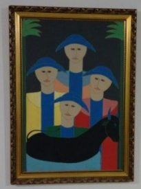 Composição integrante de um tríptico. Quatro figuras superpostas, retratadas a partir do busto, na superfície inferior da tela, boi estilizado de perfil na cor preta, chifres, orelha e olho em azul. Na parte inferior do dorso do boi tem uma espécie de copa em verde. As duas figuras que estão acima da primeira, vestem capas nas cores amarelo escuro e claro (direita) vermelho e rosa escuro (esquerda). Acima destas duas, no centro da tela, uma figura, que veste capa nas cores rosa e azul. Todas elas têm uma espécie de túnica azul que fica sob as capas e idênticos chapéus de vaqueiro estilizado na cor azul. Nas duas extremidades laterais da tela, metades de troncos de palmeira, que começam a partir da superfície inferior e estendem-se até a superior e terminando em folhas estilizadas sobre fundo preto.