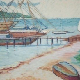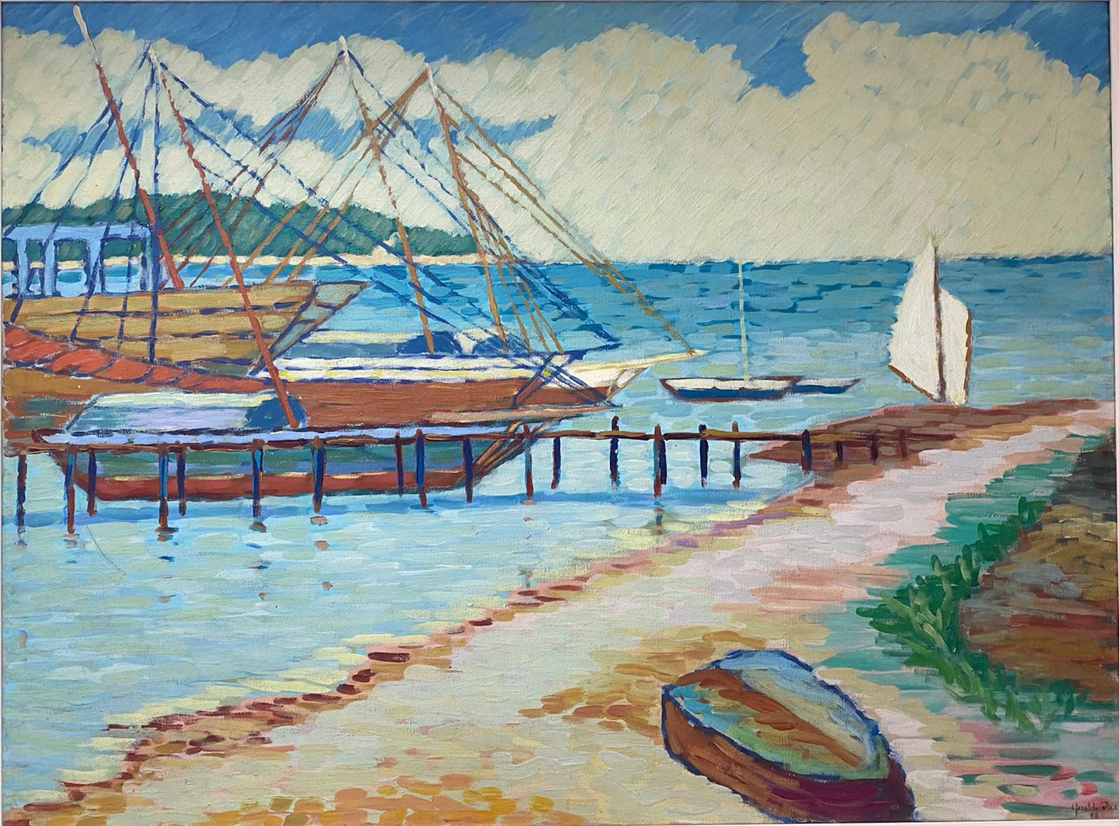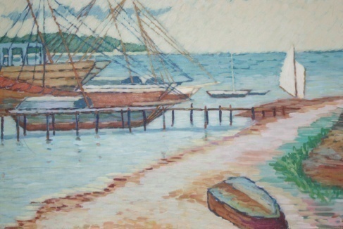 Marinha no primeiro plano da composição com areia em tons de bege, cinza, amarelo, e vermelho que forma um caminho onde encontram-se uma canoa virada. No segundo plano, pequeno ancoradouro de madeira nas cores marrom e cinza. No cais barcos grandes nas cores marrom, verde, azul e ocre. Mastros na cor marrom e cabos na cor azul. Pequenas canoas e velas brancas. O mar perde-se no infinito de nuvens brancas e céu azul. Ao longe vislumbra-se um braço de terra com vegetação.