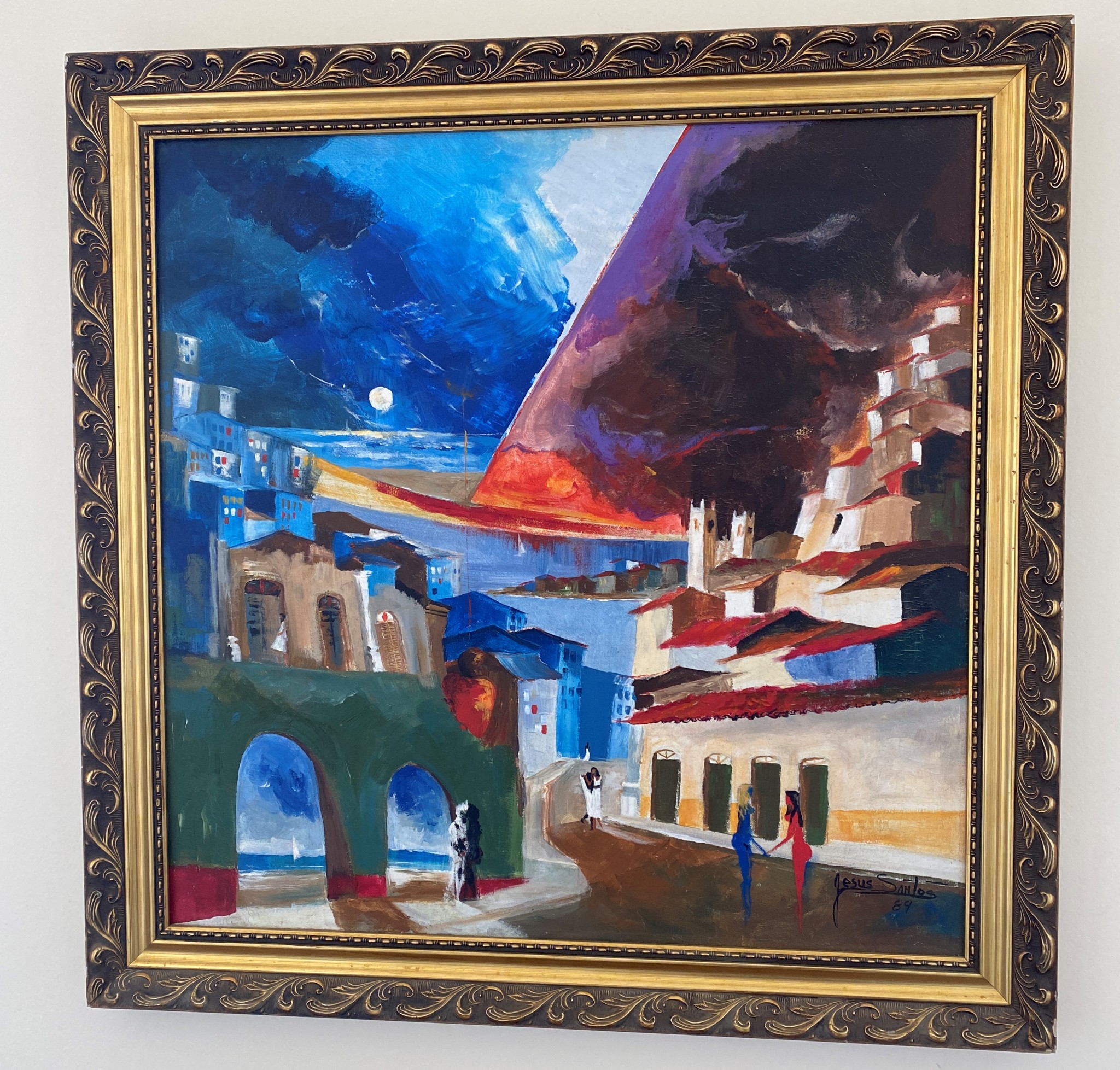 Cena retratando cidade a beira-mar. No plano inferior da tela, do lado esquerdo, muralha com dois arcos. No lado, direito, ao alto, casas com telhados vermelho, a baixo, duas mulheres de mãos dadas, conversando.