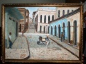 Pintura retrata rua da Praia Grande – centro histórico do São Luís. No primeiro plano da composição, rua em textura de pedras. No meio da rua carroça puxada por jumento, conduzida por um carroceiro que tem na cabeça um chapéu na cor amarela. Do lado esquerdo da tela, calçada e fachada do mercado da Praia Grande com seis portas em arco na cor marrom.