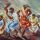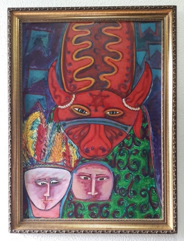 Plano central da pintura boi; na testa do boi uma estrela. Barra do boi verde com decoração em preto; aparece o “miolo” (homem que dança embaixo do boi). Do lado esquerdo da tela, na parte inferior, figura humana com cocar de penas (representando índio).