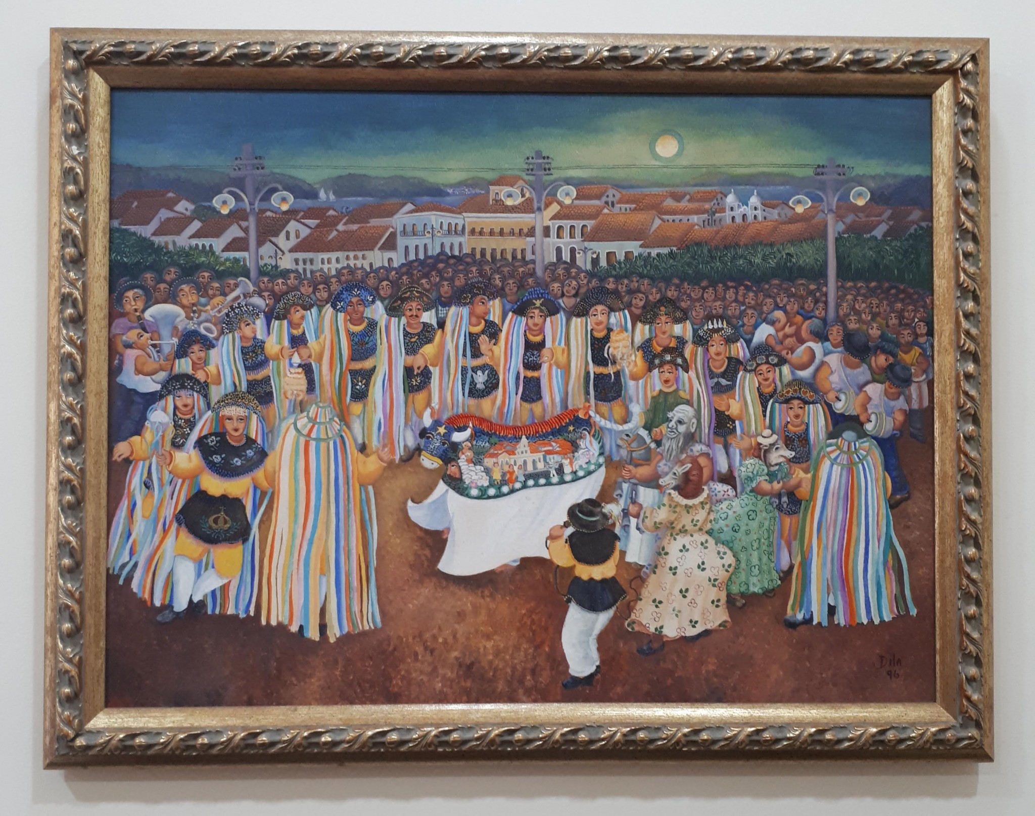 0227 Voltar 28 de julho de 2021 por   Documento 227 Baixar Anexos 108... Metadados Miniatura Compartilhar Número de ficha0227SérieColeção BEMTítuloSem TítuloAutorDilaDescrição da ObraTela retrata folclore do Maranhão: Bumba-Meu-Boi. Em primeiro plano, boi, Mãe Catirina, caboclos de fita e Ao fundo, grupo de pessoas e casario.TécnicaÓleo sobre telaDataSéc. XX - 1996Marcas/ Inscrições / LegendasNão possuiAltura60 cmLargura80 cmAssinaturaDila 96ProcedênciaBanco do Estado do MaranhãoModo de AquisiçãoDoação - Banco do Estado do MaranhãoResponsabilidade ImediataCuradoria de Bens Culturais do Palácio dos LeõesProteção legalGoverno do Estado do MaranhãoCondições de SegurançaBomObjeto Restaurado?Não Continue navegando 0228 0226 Voltar para a página de itens