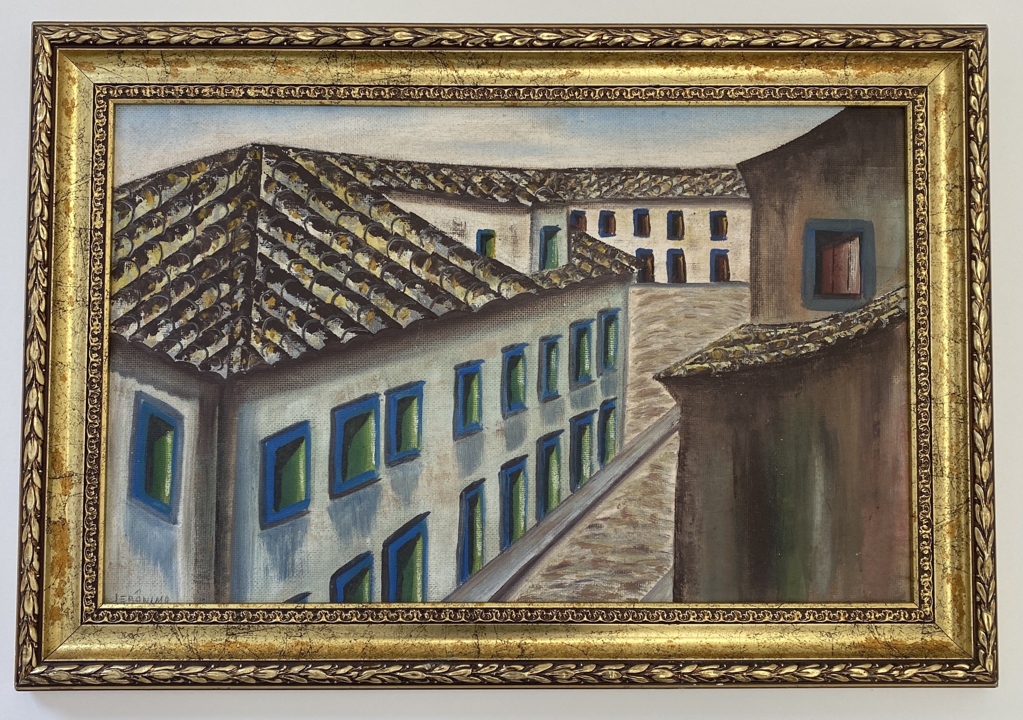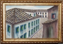 Paisagem urbana. Rua tendo como destaque um sobrado do lado esquerdo da tela, com oito janelas e oito portas, com moldura azul e folhas das janelas e das portas em verde; acima mirante com duas janelas. Do lado esquerdo da composição parte de outra casa, com destaque para uma janela. Ao fundo da composição, outro sobrado.