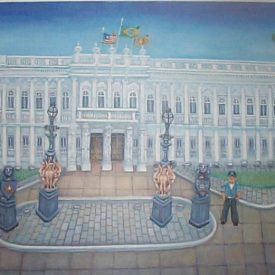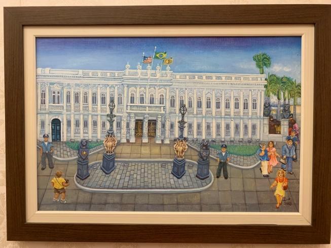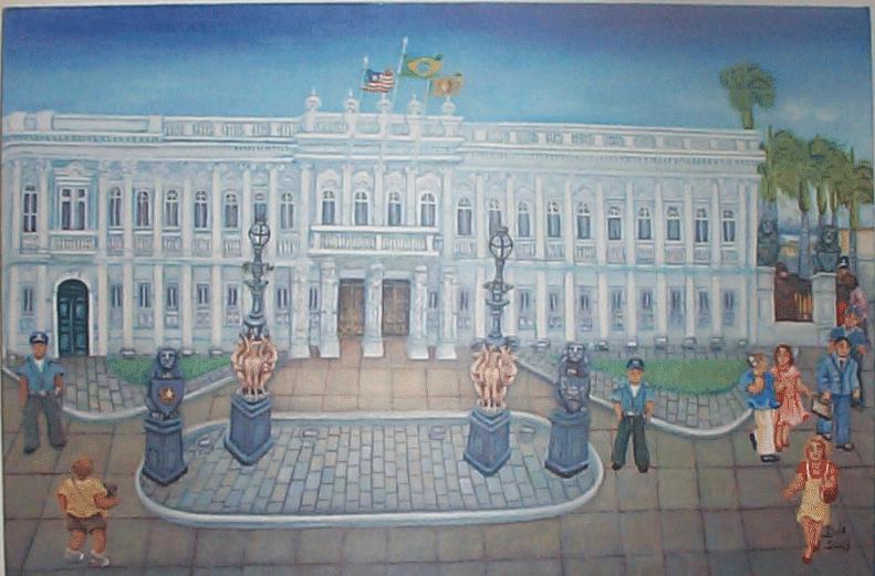 Composição retratando a fachada do Palácio dos Leões. Hasteadas as bandeiras do Brasil, Maranhão e Portugal (da esquerda para a direita); dois militares, sendo um de cada lado, próximo ao leões. Do lado esquerdo da tela, grupo de pessoas; do lado direito, de costa, uma figura masculina com máquina fotográfica.