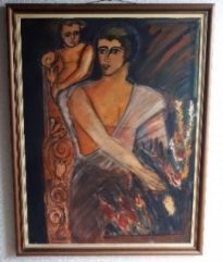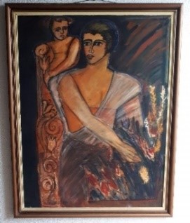 Sobre ombro direito da figura, um anjo que apoia seu braço esquerdo. No lugar do braço direito do anjo, uma tulipa e no ombro, uma voluta. Posterior ao anjo desce faixa decorada com tulipas e volutas bem marcadas na cor preta. Fundo da tela em preto.