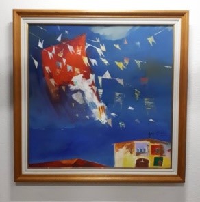 Tela retrata no primeiro plano - lado esquerdo parte de um telhado na cor marrom e do lado direito, sobrado com porta e 03 (três) janelas, sendo uma maior localizada em cima da porta. Na janela superior aparecem 03 (três) portas de casarões antigos. Nas outras 02 (duas) janelas aparecem jarros com flores.