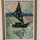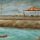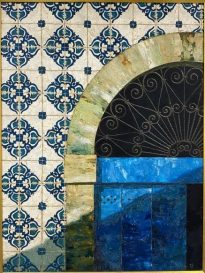 Tela com textura em alto relevo retrata trecho de uma fachada de azulejos antigos onde se destaca parte de porta na cor azul com bandeira em gradil com desenhos em volutas e portal em mármore em tons de bege e verde.