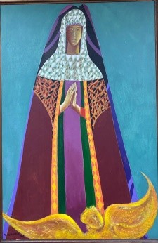 Tela retrata imagem de Nossa Senhora que ocupa toda extensão da tela. Imagem mãos unidas, roupa na cor roxa.